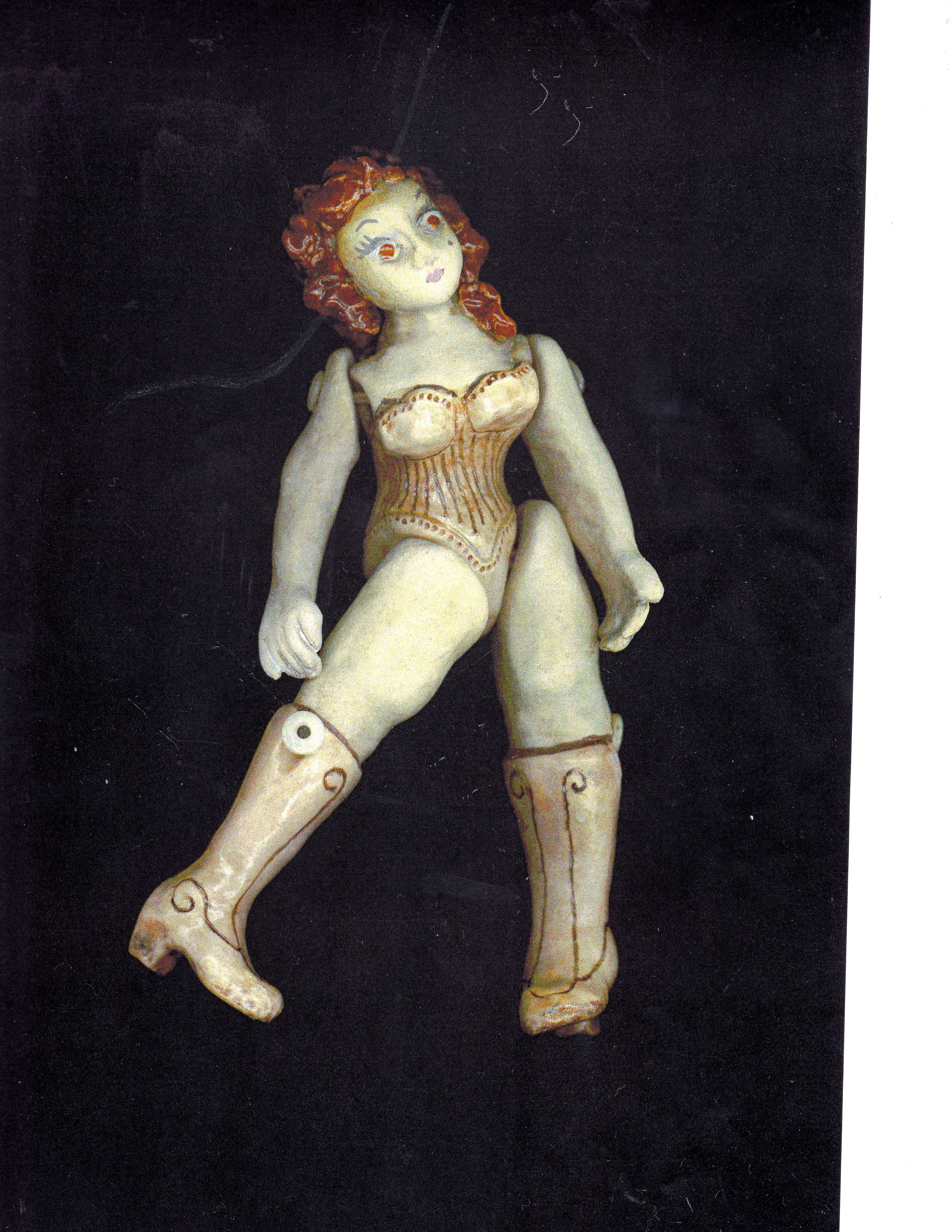 The work is cone 6, all fired clay except for the elastic cording and antique shell buttons I use to put the ladies together. I use oxides and stains, as well as under glazes for color. Some work has actually glaze on it. I often fire multiple times at increasingly lower temperatures to add color and effect.