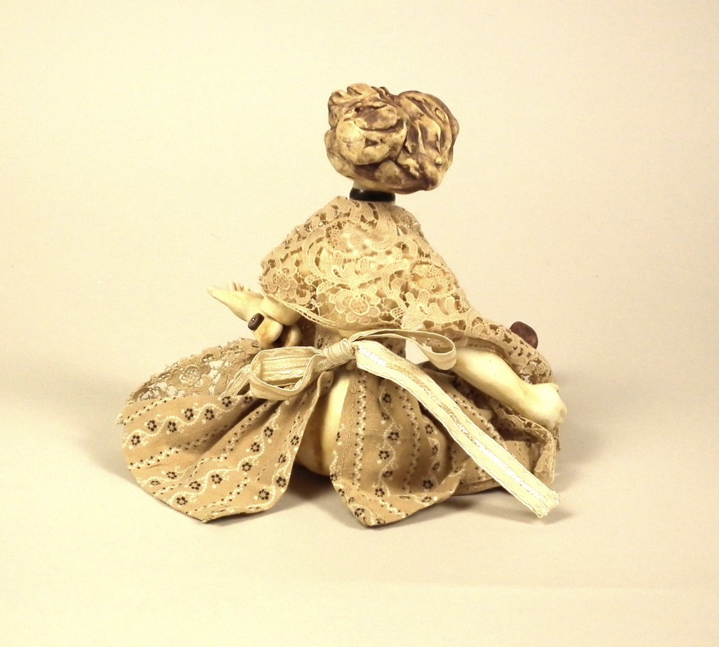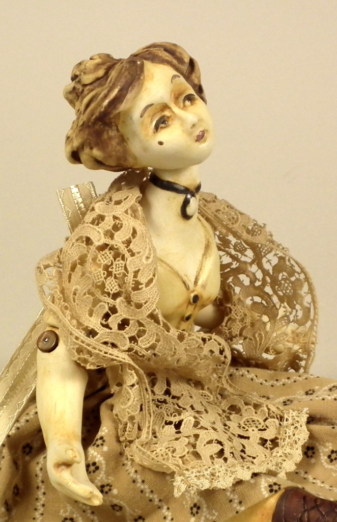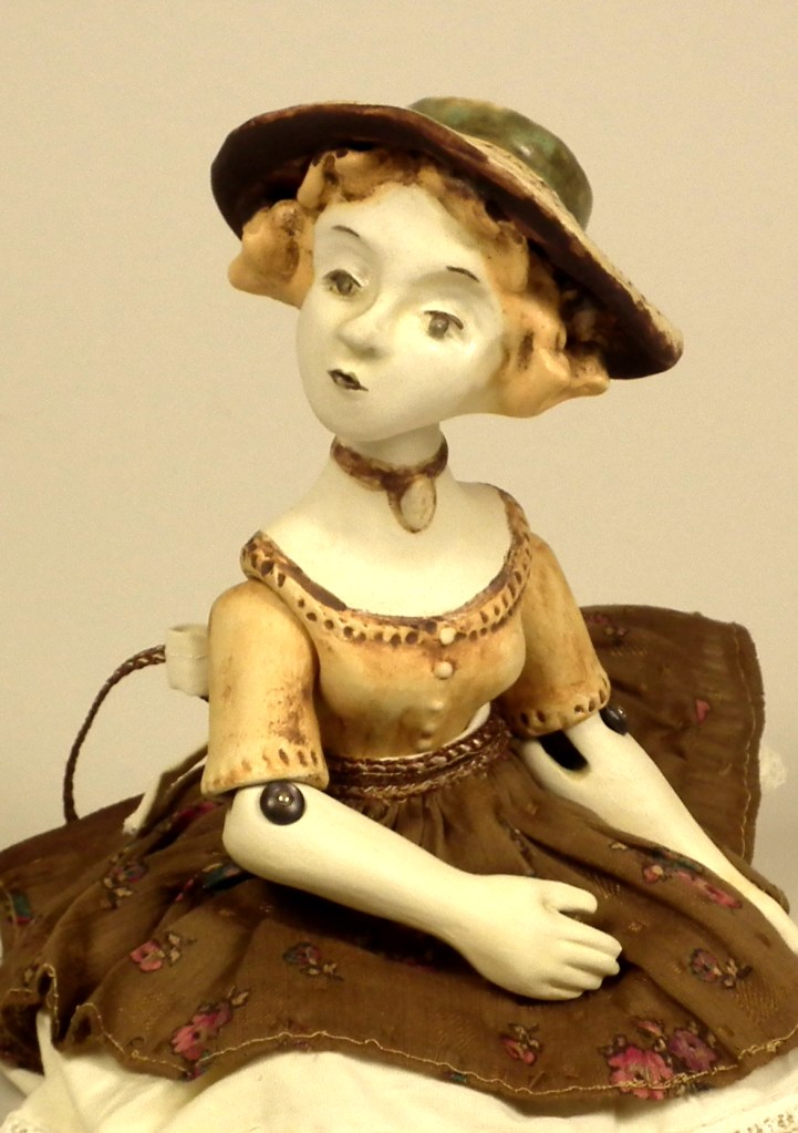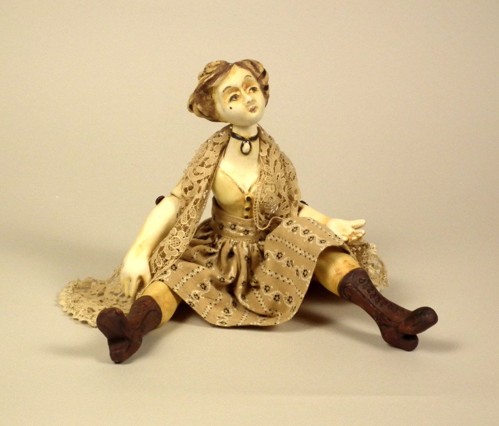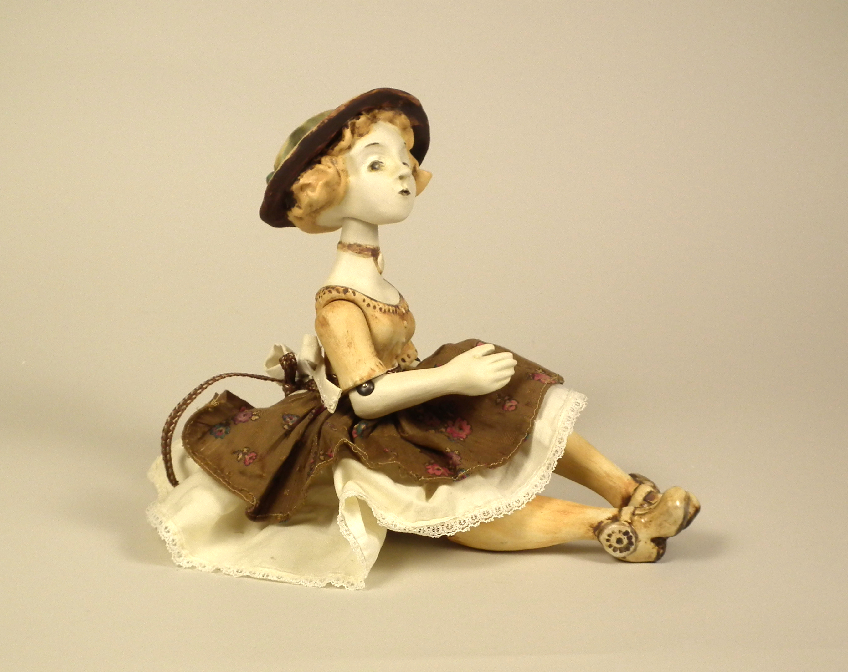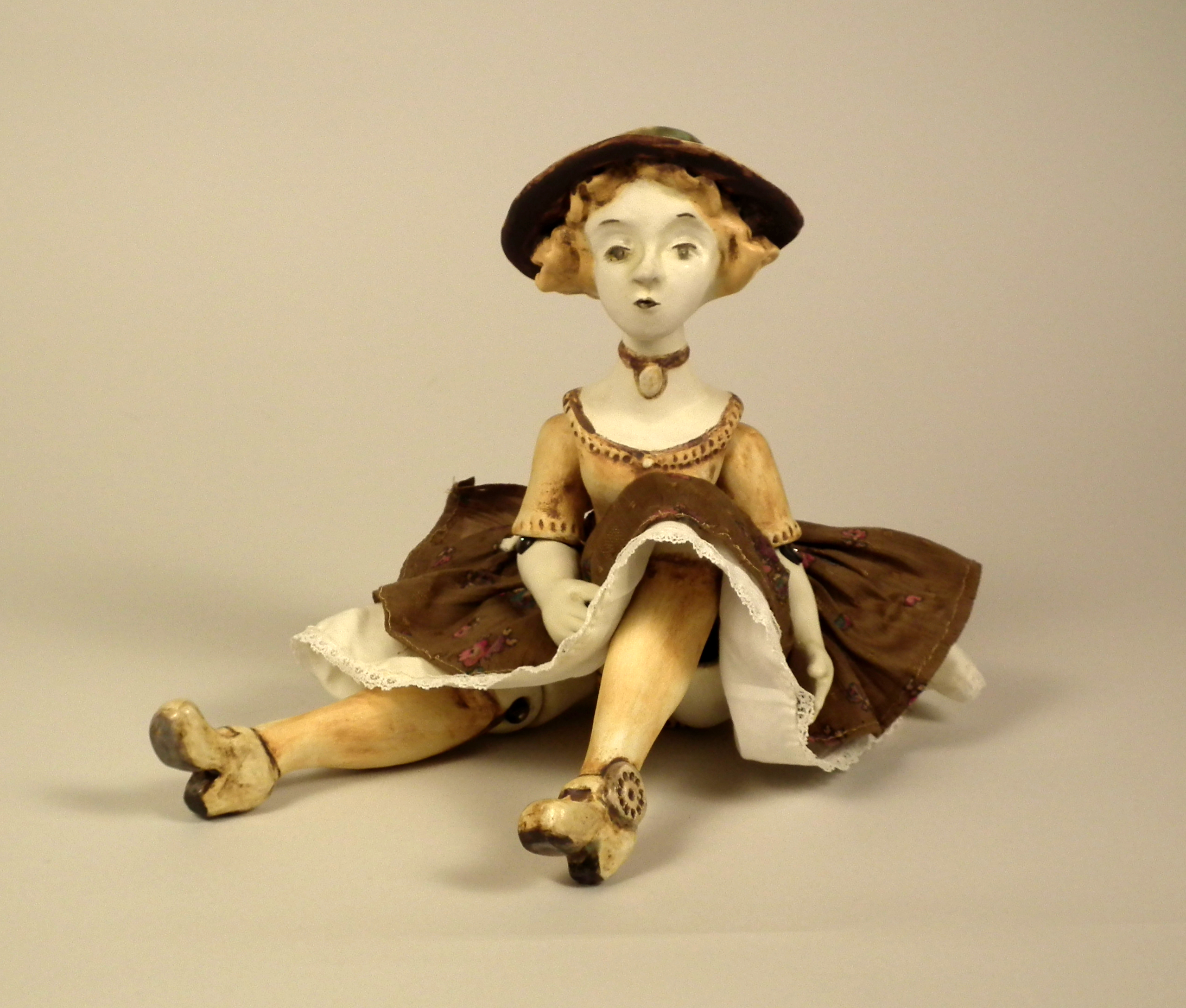 Girl with Hat – $155 Hand sculpted, mid-range ceramic. Underglazes, rutile, iron and copper oxide washes, glaze. Fully poseable, joined with elastic cord and Victorian boot buttons. Vintage materials and lace, skirt and petticoat may be removed. Size: 14″ from head to toe. Available through Sidestreet Arts