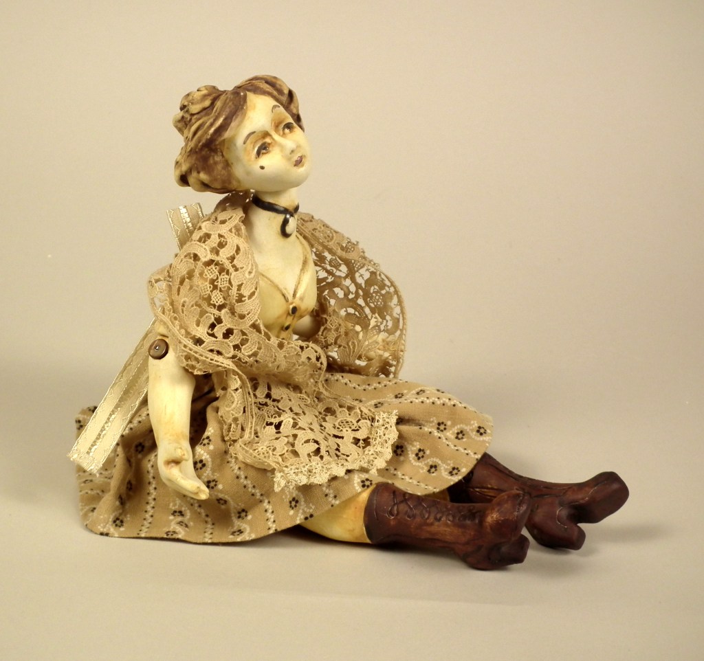 Girl with Boots $155.00 Hand sculpted, mid-range ceramic. Underglazes, rutile, iron and copper oxide washes, glaze. Fully poseable, joined with elastic cord and Victorian boot buttons. Vintage materials and lace, skirt and shawl may be removed. Size: 13″ from head to toe